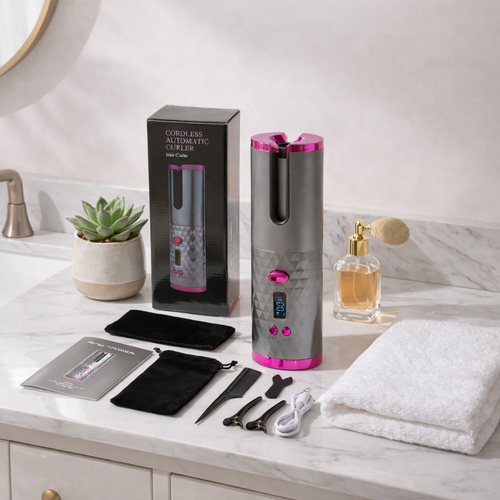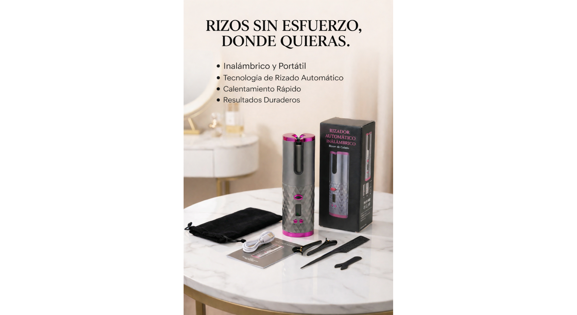 El rizador automático inalámbrico tiene un sistema inteligente que te permite configurar la temperatura, el tiempo de rizado (8S, 14S Y 18S) y la dirección de los rizos ( izquierda o derecha)